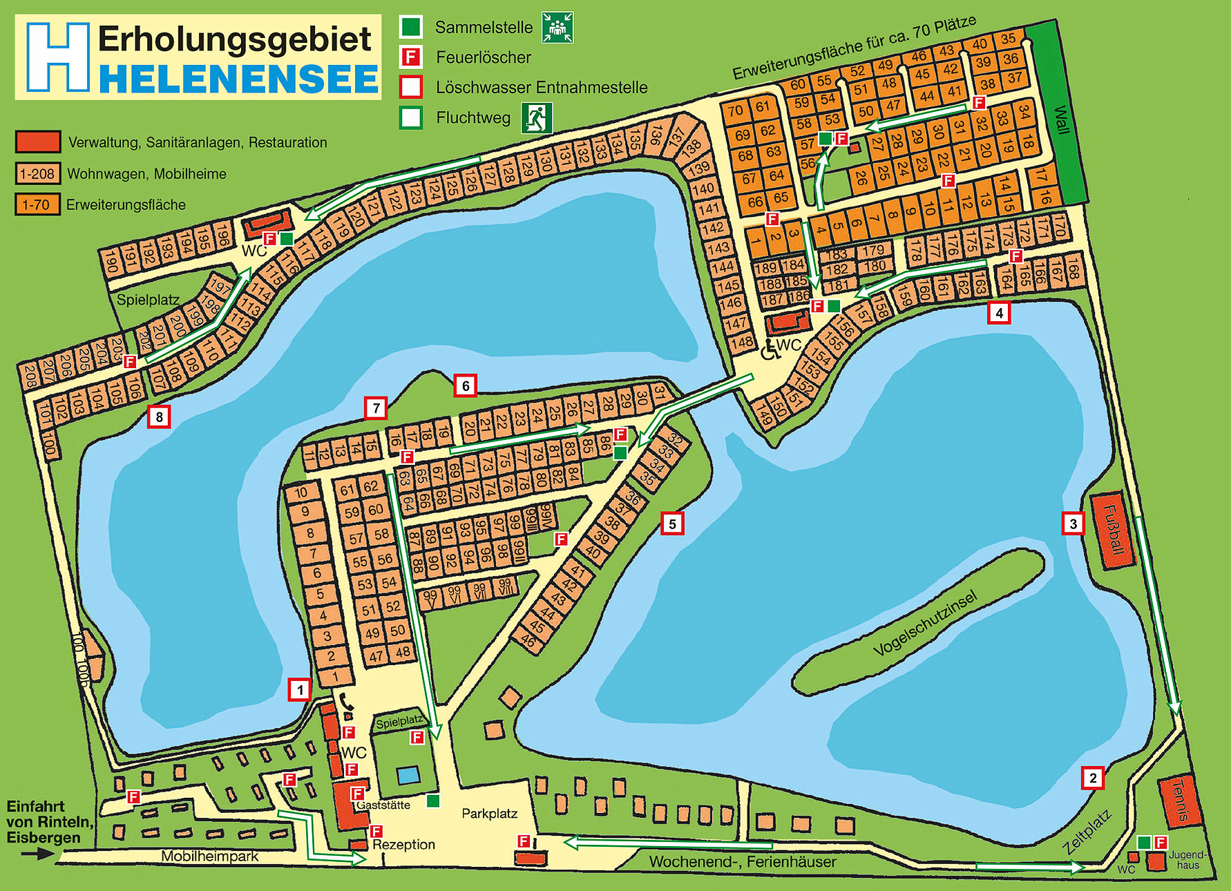 Im idyllischen Weserbergland bei Rinteln an der Weser, liegt das Erholungsgebiet HELENENSEE. Über 300 Wohnwagen, Mobilheime und Ferienhäuser finden dort am Ufer des Helenensees einen Platz. Alle Plätze haben Strom, Wasser und sind ans Kanalisationsnetz angeschlossen. Plätze für Touristencamper stehen ebenfalls zur Verfügung.